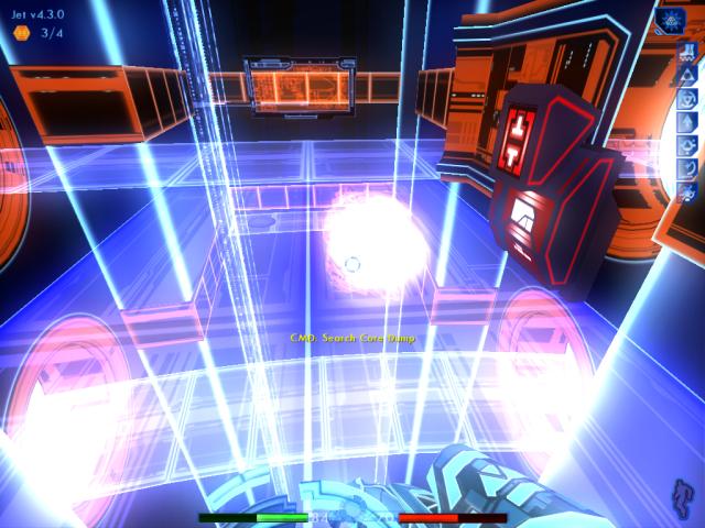 Grab what core dumps you can, but then high-tail it down into the next room where the arrow shows.