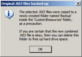 Once a combine operation is completed, a warning dialog appears to let you know that the original .rez files have been backed up into a newly created backup folder. Once you are sure that the newly combined .rez is okay, delete the folder with the pathname x:\YourTronDir\Custom\Resources\Backup. If you don't delete the folder yourself, the program will remind you that it's still there the next time REZ Handler runs. The option of deleting it is then presented.