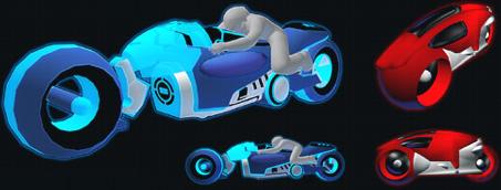 There are now two types of Light Cycles. On the right is the classic version of the Light Cycle from the On the left is the new Super Cycle. These don't turn or accelerate as quickly as the classic Cycles, but have a higher top speed and can outrun the older model. |